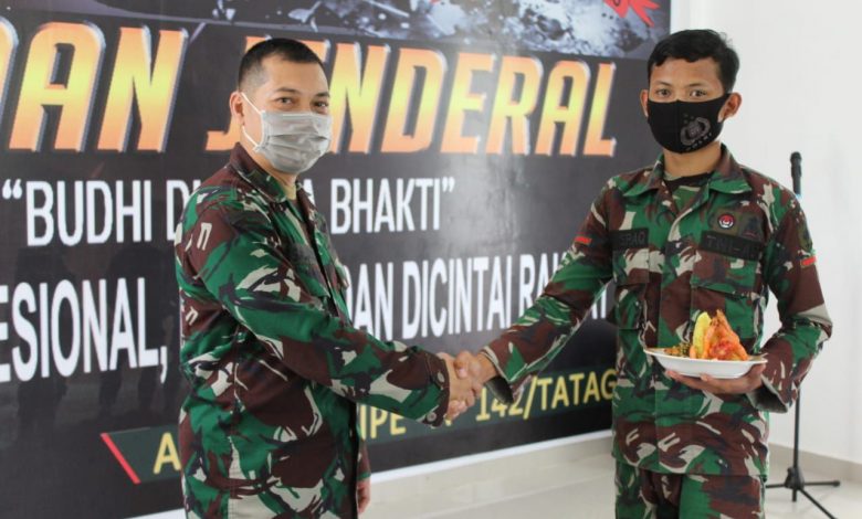 Usai membacakan Sambutan Direktur Ajudan Jenderal TNI – AD, Ka Ajenrem tipe ” A ” Mayor Caj. Anggi Salamun, S.Sos memotong tumpeng dan diserahkan kepada Prajurit termuda Prada Muh. Israq yg lahir pada tanggal 10 Oktober 2000.