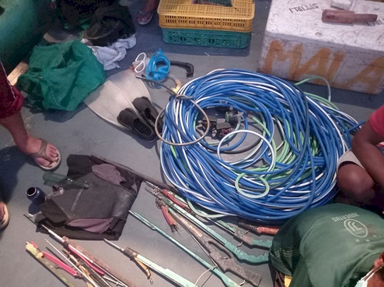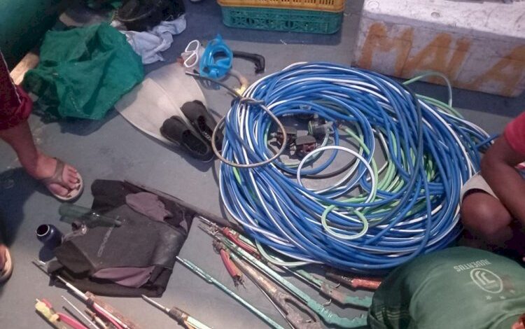Adapun barang bukti yang diamankan berupa satu unit KM. Cahaya hidup, satu unit kompresor, delapan unit baterai merk ABC, dua unit kaca mata selam, Selang panjang 125 meter, tiga unit regulator, lima unit bunde, satu pasang sepatu katak, satu unit baju selam, sembilan unit panah, dua unit senokel, delapan unit korek api, satu unit botol kaca, satu unit keranjang, satu box ikan jumlah 230 ekor ikan campuran, dua unit mesin merk dompeng dan tiga unit engkol.