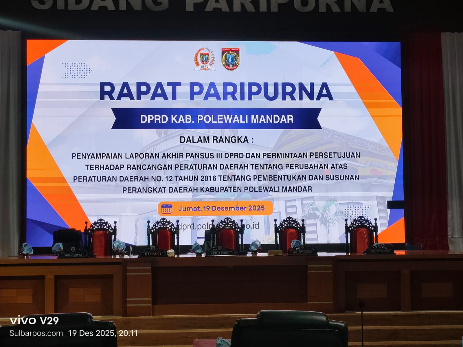 BeritaNasional. ID POLMAN SULBAR–Kabupaten Polewali Mandar (Polman) resmi mengesahkan Rancangan Peraturan Daerah (Ranperda) tentang Perubahan atas Perda Nomor 12 Tahun 2016 tentang Pembentukan dan Susunan Perangkat Daerah menjadi Peraturan Daerah (Perda), dalam rapat paripurna Jumat malam, 19 Desember.