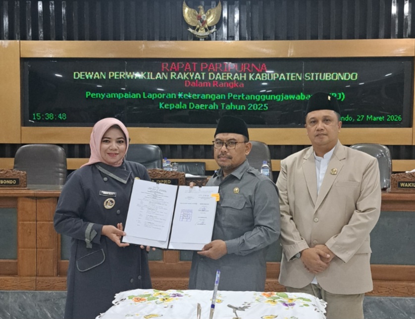 Kedua Raperda tersebut yakni tentang Fasilitasi Penyelenggaraan Pesantren serta Kemudahan, Pelindungan, dan Pemberdayaan Koperasi serta Usaha Mikro. Pengesahan dilakukan dalam rapat paripurna DPRD dan dihadiri pula oleh Wakil Bupati Situbondo Ulfiah digelar pada Jumat (27/3/2026).
