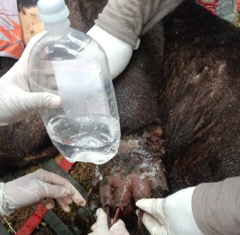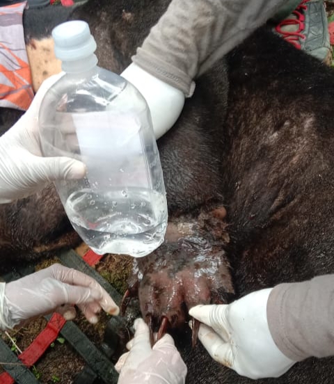 Setelah tim medis melakukan observasi makro, selanjutnya dilakukan pengobatan terhadap kaki kanan yang terluka. Dan berdasarkan pengamatan luar, luka tidak terlalu membahayakan, sehingga satwa beruang yang kedua langsung dilepasliarkan ke kawasan Taman Nasional Gunung Leuser.