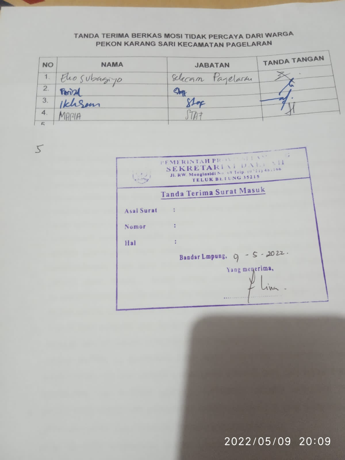 Kali ini, perwakilan warga masyarakat setempat mendatangi kantor Camat Pagelaran, kantor inspektorat kabupaten Pringsewu, kantor Dewan Perwakilan Rakyat (DPRD) Kabupaten Pringsewu, kantor Bupati Pringsewu hingga kantor gubernur Lampung, menyerahkan pengajuan mosi tidak percaya terhadap kepala Pekon setempat, Senin (9/5/22).