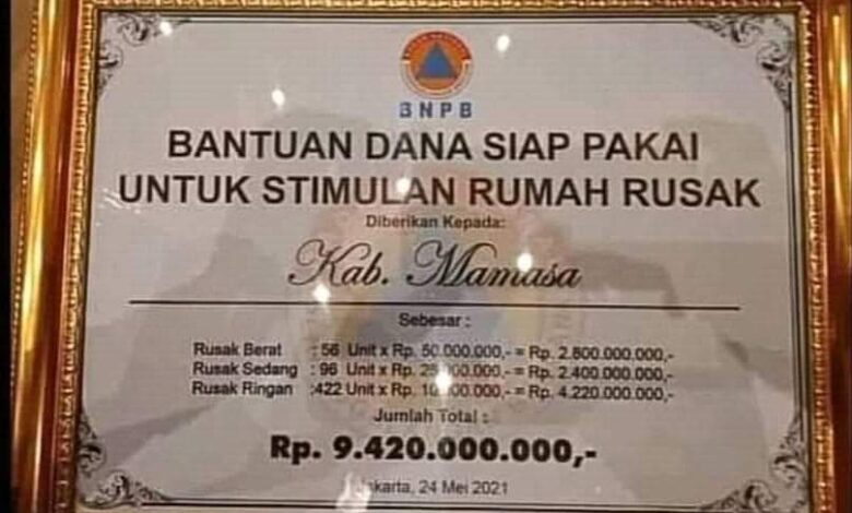 Adapun jumlah anggaran bencana alam Prov Sulbar tahun 2021 untuk kab Mamasa sebesar 9 M 420 Juta. Anggaran sebesar 9 Milyar lebih itu diperuntukkan untuk korban bencana di beberapa titik diantaranya di desa Burana Kecamatan Tabulahan,Kelurahan Lakahang, baruru dan beberapa titik lainnya terdampak gempa Sulawesi barat. (Awt)