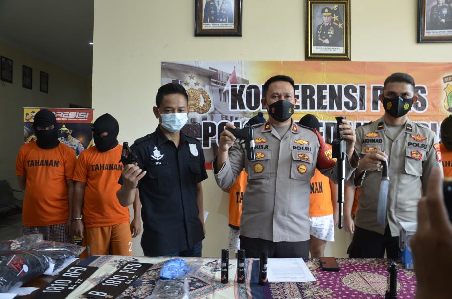 “Mereka melakukan kekerasan dengan golok ini digunakan untuk melakukan penusukan di lengan kiri, ada juga pelaku yang menyetrum istri korban dan ibu korban serta menggunakan semprotan cabai,” ujar Kapolsek Medan Satria Kompol. Agus Rohmat kepada media pada Senin (13/09/21).