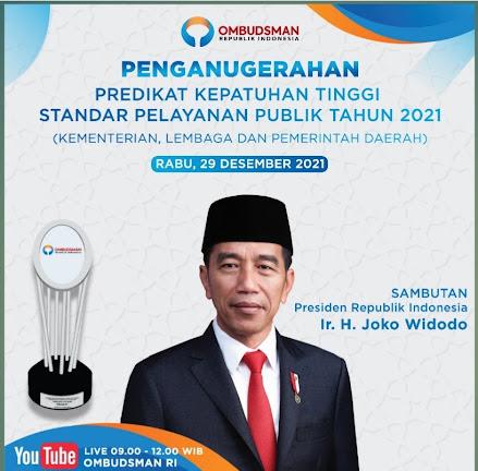 Ombudsman RI mengumumkan hasil penilaian Kepatuhan Standar Pelayanan Publik Tahun 2021 pada 24 Kementerian, 15 Lembaga, 34 Provinsi, 98 Kota dan 416 Kabupaten, pada Rabu, 29 Desember 2021. Acara ini dilakukan sebagai upaya percepatan peningkatan kualitas pelayanan publik.