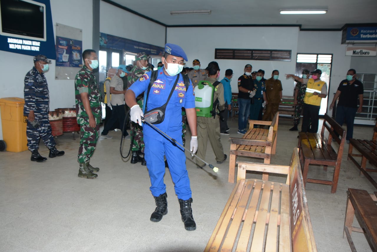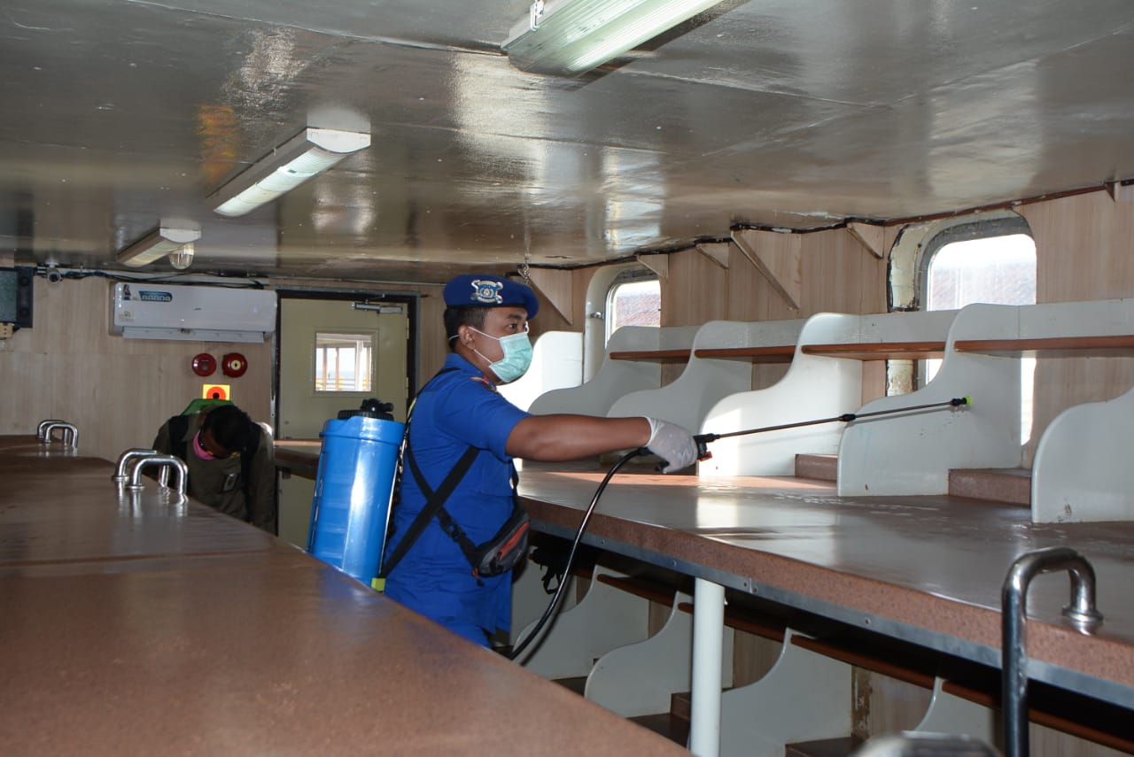 Pada kesempatan tersebut, Forkopimda turun langsung menjelaskan kepada para penumpang cara mencuci tangan yang benar, membagikan masker dan juga dilakukan penyemprotan disinfektan didalam kapal penyeberangan.