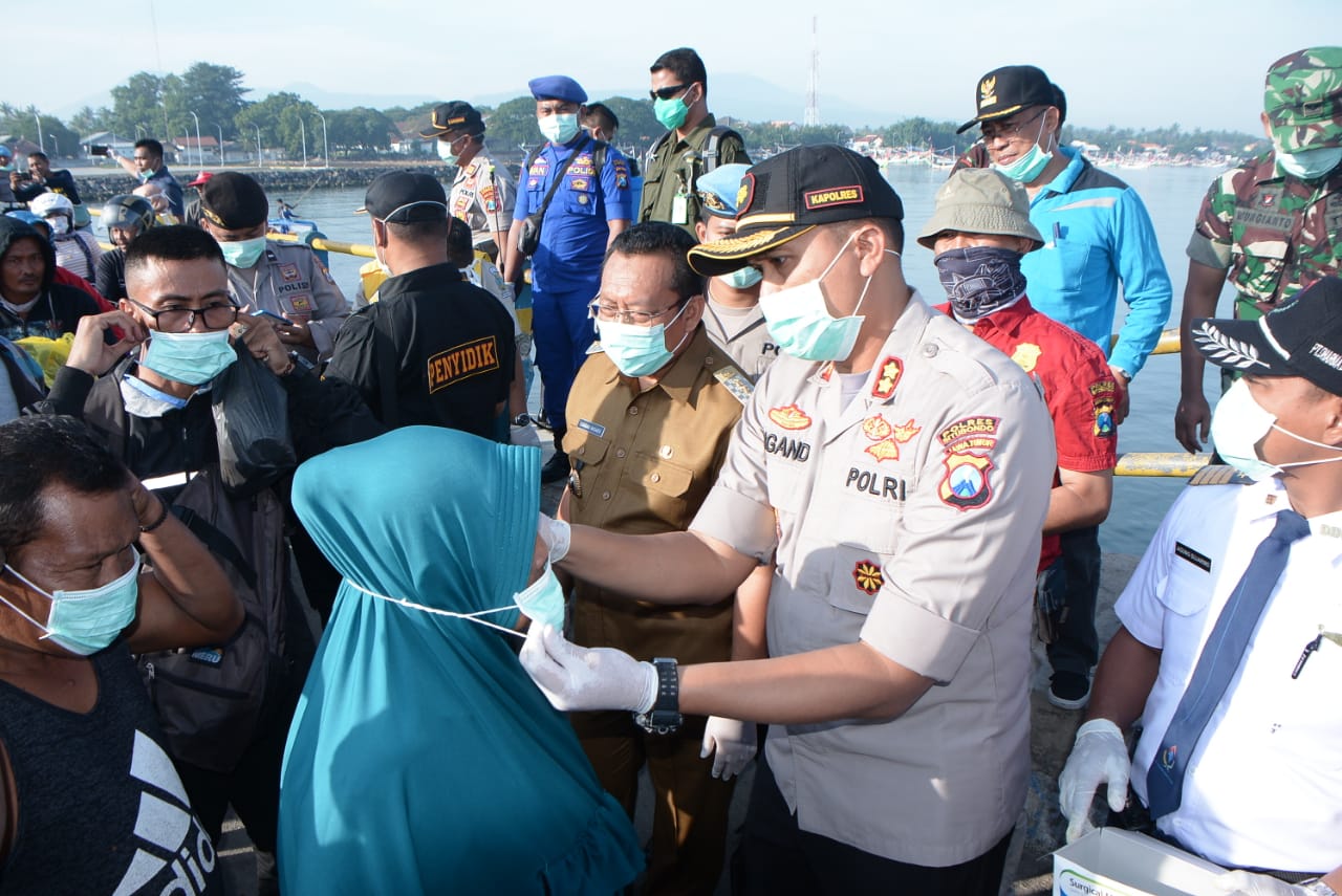 Kapolres menyampaikan bahwa, Forkopimda bersama petugas KKP ( Karantina Kesehatan Pelabuhan) Probolinggo, KUPP Panarukan dalam rangka pencegahan penyebaran virus corona atau Covid – 19 pada sarana perhubungan laut di Pelabuhan Jangkar dan Layanan Hubla Fery milik PT. Dharma Dwipa Utama dan melakukan koordinasi persiapan kegiatan preventif penyebaran Covid – 19.