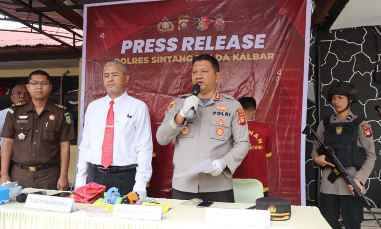 BeritaNasional.ID, SINTANG KALBAR – Polres Sintang menggelar press release pengungkapan kasus tindak pidana narkotika di wilayah hukum Polres Sintang sekaligus pemusnahan barang bukti narkoba di halaman Mapolres Sintang, Senin (14/8/2023).