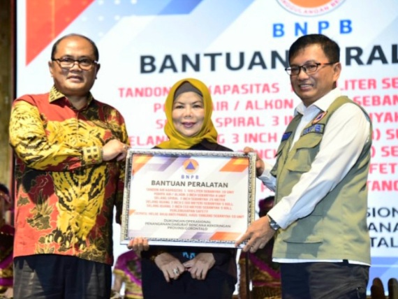 Atas bantuan yang diserahkan tersebut, Asisten II Handoyo Sugiharto mengucapkan terimakasih kepada BNPB. Menurutnya, saat ini terdapat beberapa daerah yang sedang mengalami krisis air bersih. Dengan sarana dan prasarana yang ada, Pemprov Gorontalo telah menyalurkan air bersih ke lokasi kekeringan, tetapi terkendala dengan mobil tangki air yang ada sudah tidak bisa mejangkau ke lokasi dataran tinggi. Padahal justru masyarakat di sana sangat membutuhkan air bersih.