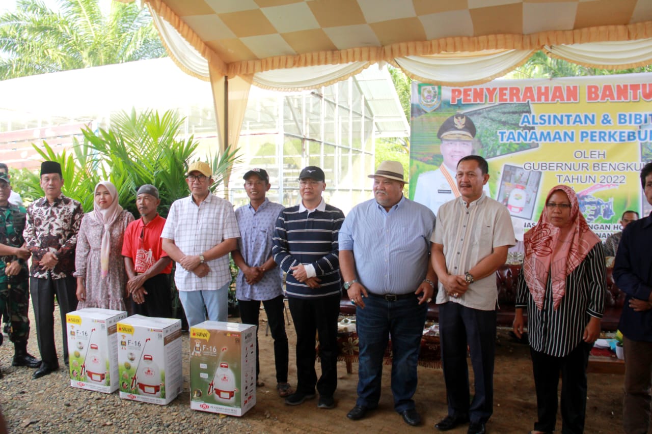 Bengkulu Selatan,Beritanasional.id – Tingkatkan produktivitas komoditas perkebunan, Gubernur Bengkulu Rohidin Mersyah menyerahkan bantuan Alat dan Mesin Pertanian (Alsintan) dan Bibit Tanaman Perkebunan. Di antaranya adalah bibit Pala dan bibit Kelapa Sawit kepada Kelompok Tani di Kecamatan Pino Raya Kabupaten Bengkulu Selatan, juga perwakilan Kelompok Tani Kabupaten Kaur, dengan total 22.000 bibit dan 15 Hand Sprayer, Sabtu (6/8/2022).