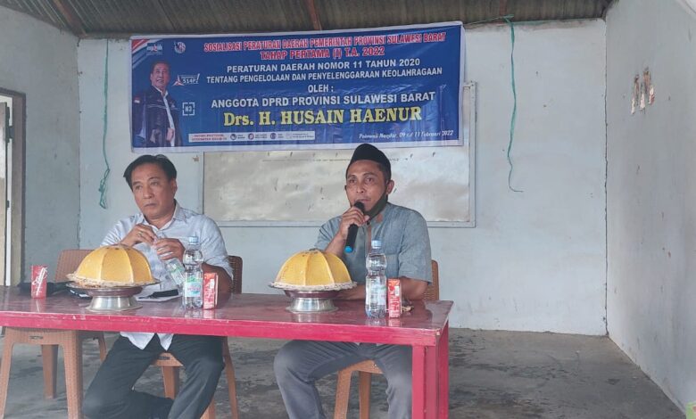BeritaNasional.ID.Sulbar — Anggota DPRD Prov. Sulawesi Barat Drs. H. Husain Haenur Komisi III melaksanakan Sosialisasi Peraturan Daerah Nomor 11 Tahun 2020 tentang pengelolaan dan penyelenggaraan keolahragaan di Desa Campurejo kec. Wonomulyo kab. Polman