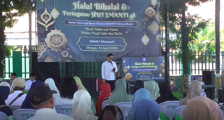 BeritaNasional.ID. Magetan, Jatim – Suasana penuh keakraban mewarnai acara Halal bihalal Ikatan Keluarga Besar Alumni SMA Negeri 1 Maospati (IKA –SMANTI)  Kirana Bhakti angkatan 1980 hingga 2020 yang berlangsung di Aula SMANTI, Minggu (12/4/2026)