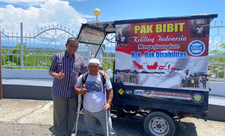 Pak Bibit yang berkeliling indonesia untuk memperjuangkan hak-hak disabilitas ini disambut dengan ramah oleh Amran Mahmud. Pak Bibit keliling Indonesia dengan mengendarai kendaran roda tiga.