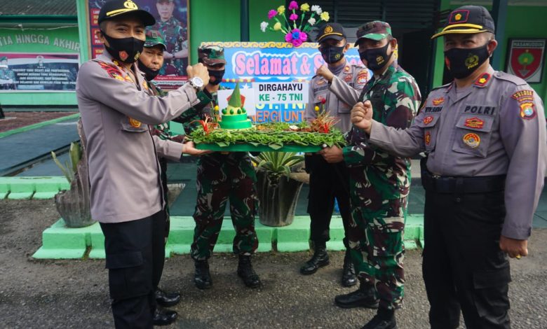 Polman.Sulbar .Beritanasional.id —Pejabat Utama Polres Polman‘menyerbu’ Kompi Senapan B Yonif 721/Mks untuk memberi ucapan selamat Hari Ulang Tahun ( HUT) TNI ke-75. Suasana tampak meriah dan semarak namun tetap memperhatikan protokol kesehatan dengan mengunakan masker dan jaga jarak.
