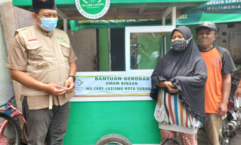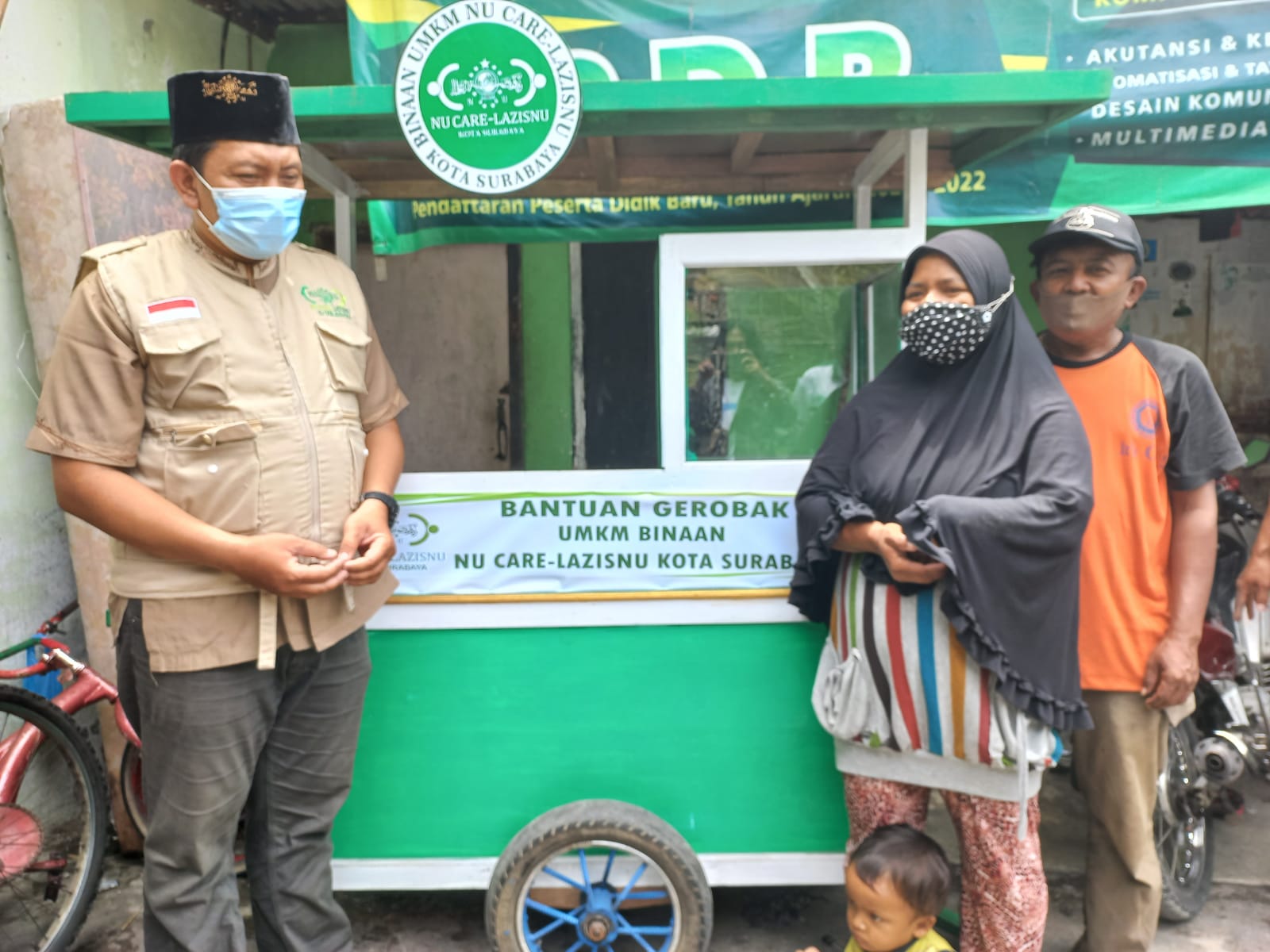 Seperti yang dilakukan Lembaga Amil Zakat, Infaq dan Shodaqoh Nahdlatul Ulama (NU Care Lazisnu) Kota Surabaya bersama Lazisnu Kecamatan Wonocolo menyalurkan bantuan gerobak UMKM Binaan kepada pedagang kaki lima di kawasan Wonocolo, Kamis (23/9/2021).