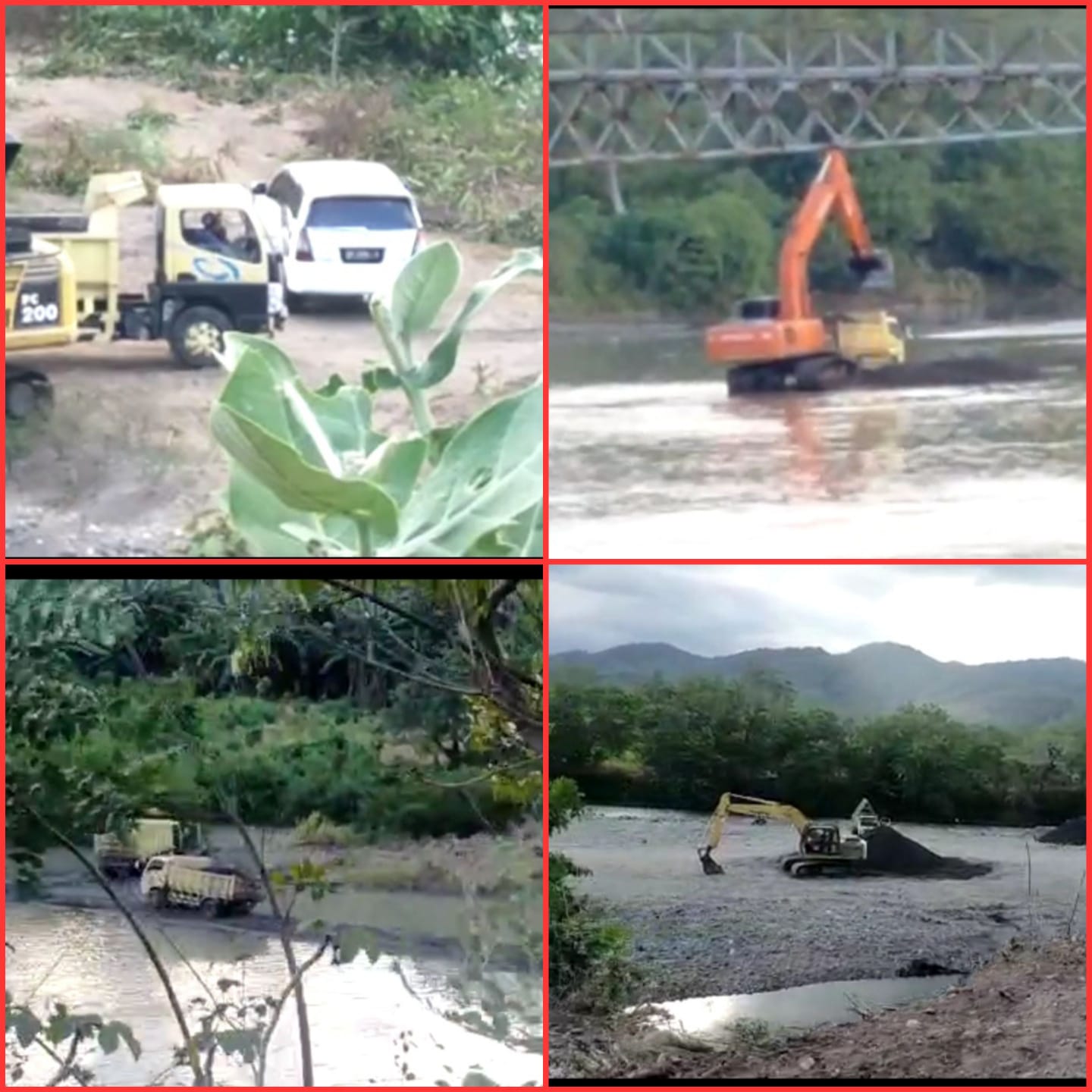 Di titik 2 (sekitar 300 meter dari tanggul, red), tampak 2 unit excavator berada di lokasi tersebut. Tampak 1 Unit sedang beraktivitas di sisi timur sungai. Sedangkan excavator lainnya sedang di parkir di tepi sungai (bagian timur, red). Tiga unit truck terlihat di lokasi ini. Tampak juga 1 unit mobil Inova berwarna putih diparkir di lokasi ini.