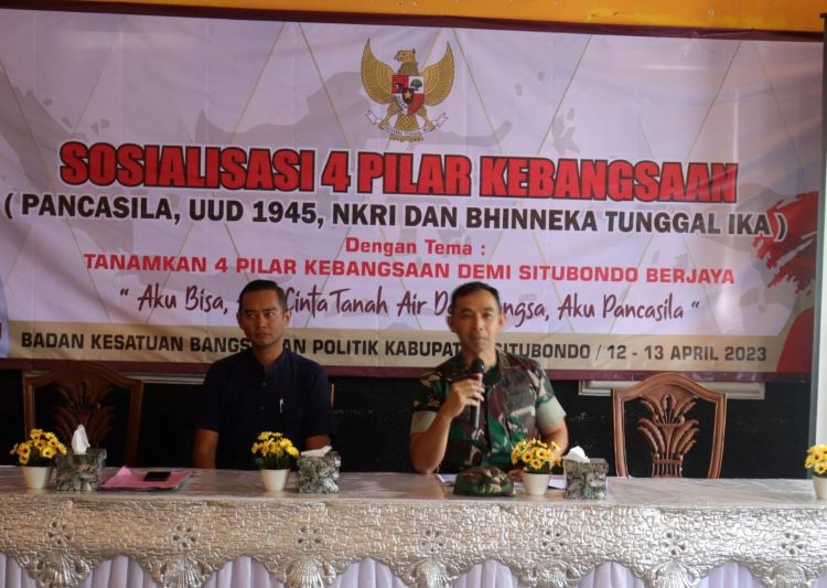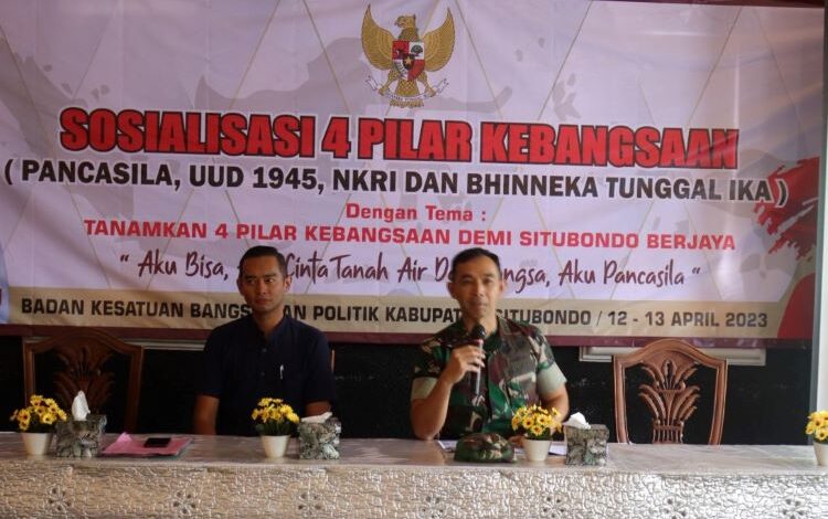 BeritaNasional.ID-Situbondo Jawa Timur, Wawasan Kebangsaan pada hakikatnya merupakan Implementasi nilai-nilai yang bersumber dari 4 konsensus dasar, yaitu Pancasila, UUD 1945, NKRI, dan Bhinneka Tunggal Ika. Demikian disampaikan Komandan Kodim 0823 Situbondo Letkol inf Bayu Anjas Asmoro, SE, ketika menjadi narasumber pada sosialisasi wawasan kebangsaan yang dilaksanakan Bakesbangpol Situbondo, Rabu (12/4/2023).
