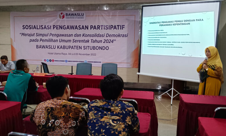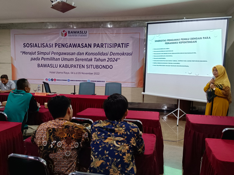 SITUBONDO JAWA TIMUR, BeritaNasional.id – Dr Luluk Maktumah Dosen Universitas Ibrahimy dan mantan Anggota Panwaslu Situbondo periode tahun 2017-2018 dihadapan peserta Sosialisasi Pengawasan Partisipatif yang dilaksanakan Bawaslu Kabupaten Situbondo dalam materinya menerangkan bahwa Pengawasan Partisipatif sangat penting, Jumat (4/11/2022).