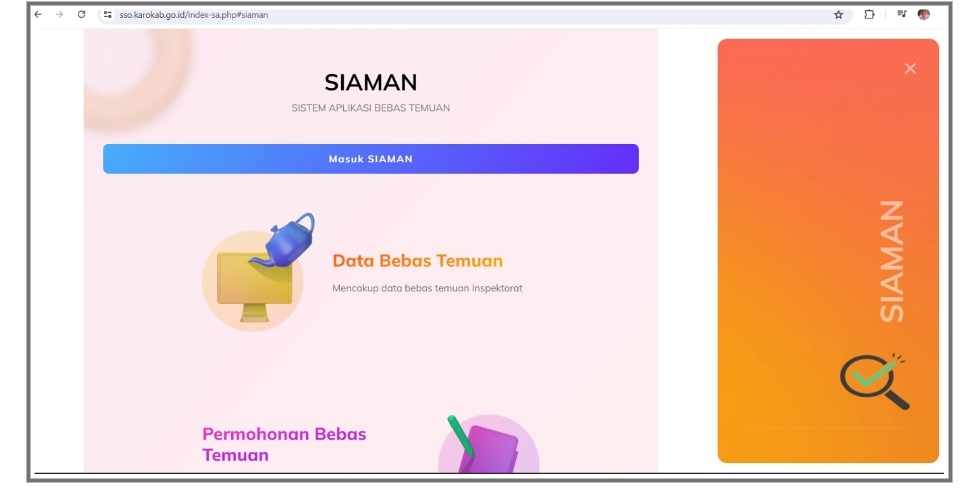 Untuk mempercepat dan memudahkan ASN dalam pengurusan dokumen bebas temuan, Inspektorat Daerah Kabupaten Karo telah meluncurkan Aplikasi Bebas Temuan dan dinamakan “SIAMAN” yang mudah diakses dari mana saja selama ada jaringan internet.