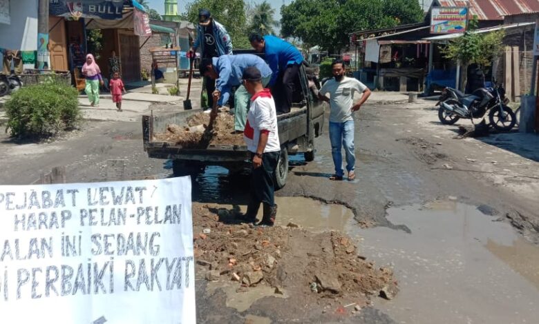 Pantauan wartawan, sejumlah gabungan tokoh muda dari Kecamatan Nibung Hangus Kabupaten Batubara secara swadaya bergotong royong tutupi jalan yang berlobang diseputaran jalan protokol Nibung Hangus. Minggu, (03/10/2021).