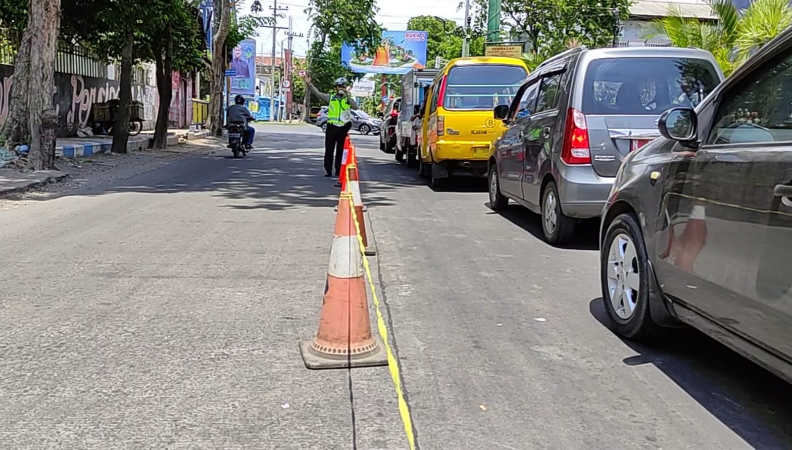 “Maka Satlantas melakukan upaya kanalisasi dengan memasang traffic cone serta mengedepankan tindakan pre-emtif dan imbauan kepada pengguna jalan,” tutur Kasat Lantas.