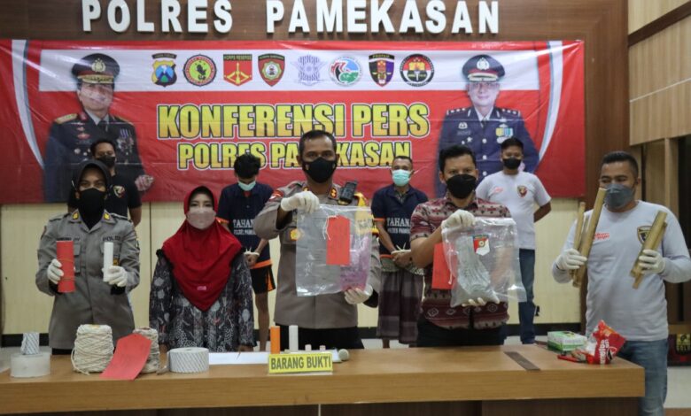 BeritaNasional.ID Given Polda Jatim – Kapolres Pamekasan AKBP Rogib Triyanto,. didampingi Kasat Reskrim Polres Pamekasan AKP Eka Purnama, Kasihumas Polres Pamekasan AKP Nining Dyah Ps dan Kanit Reskrim Ipda Kadarisman menggelar Konperensi Pers ungkap kasus bahan peledak atau serbuk petasan di wilayah Hukum Polres Pamekasan.