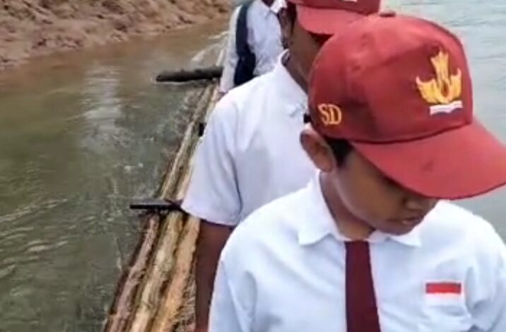 Mereka setiap hari menggunakan rakit yang terbuat dari bambu berukuran 2×10 meter untuk menyebrangi sungai untuk pergi ke Sekolah.