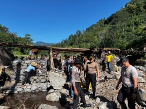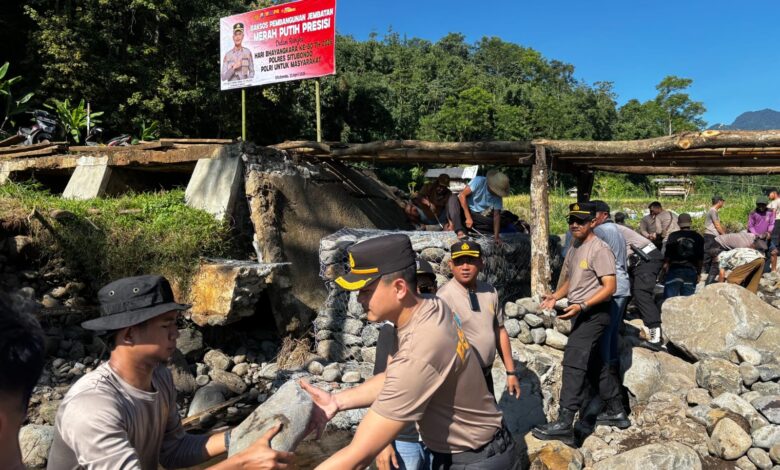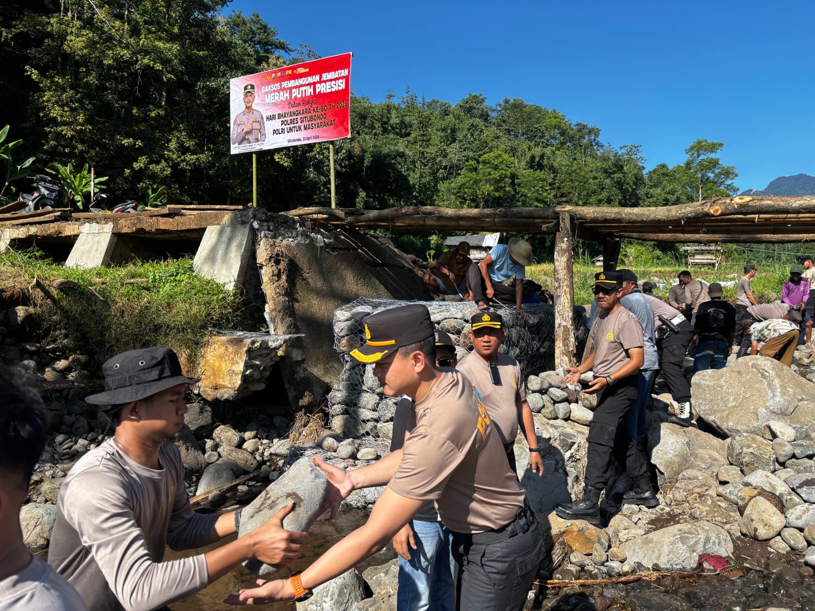 Kapolres Situbondo AKBP Bayu Anuwar Sidiqie memimpin langsung kegiatan tersebut. Tanpa canggung, ia ikut mengangkat material dan merakit pondasi jembatan bersama masyarakat.
