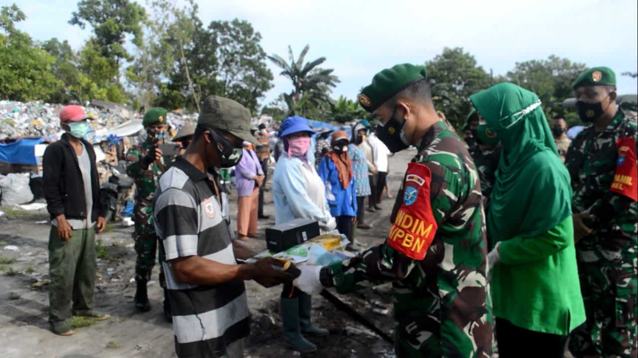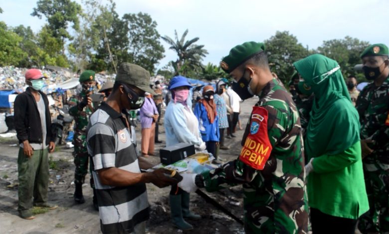 ” Kami menyambangi warga yang kegiatannya di sekitar Tempat Pembuangan Sampah Ahir Desa Pasir Panjang ini. Saat Pandemi seperti ini tentunya mereka juga merasakan dampaknya oleh karena itu kami memberikan sedikit bantuan berupa paket sembako, semoga dapat membantu meringankan perekonomian mereka, ” Ungkap Dandim saat berada di lokasi TPA.