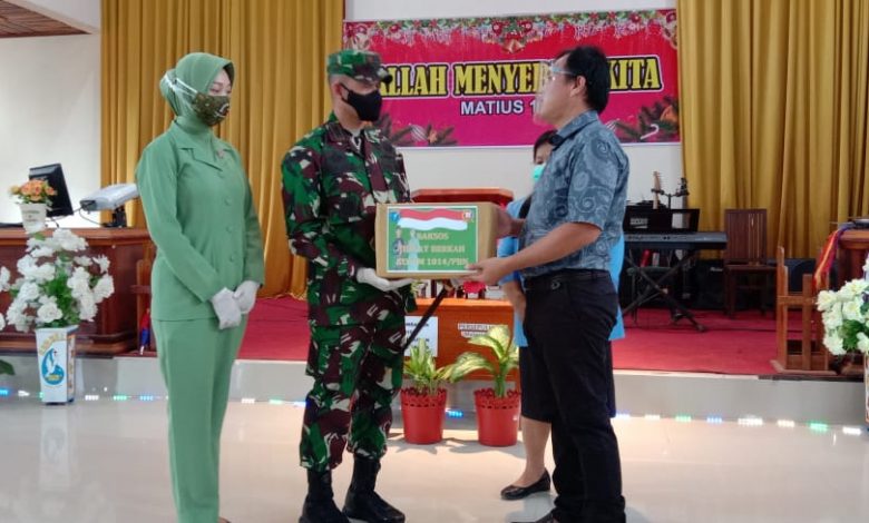 Disela sela pembagian Bansos, Dandim juga menghimbau kepada jemaat untuk selalu menerapkan protokol kesehatan di saat beribadah gereja maupun dirumah guna memutus penyebaran covid 19. (4n5)