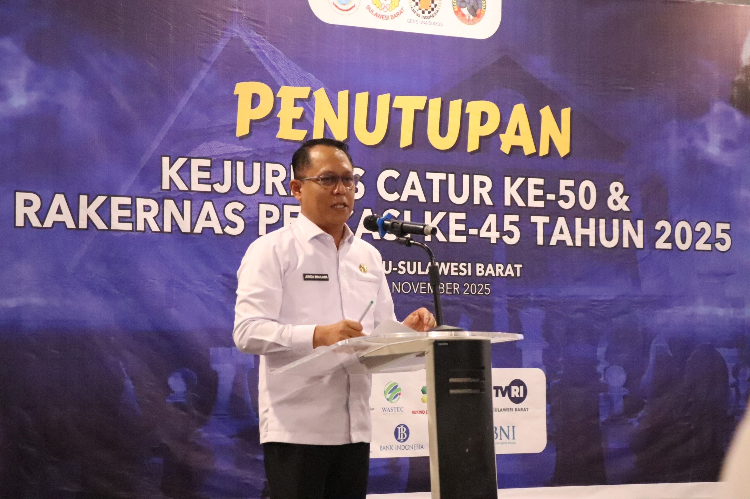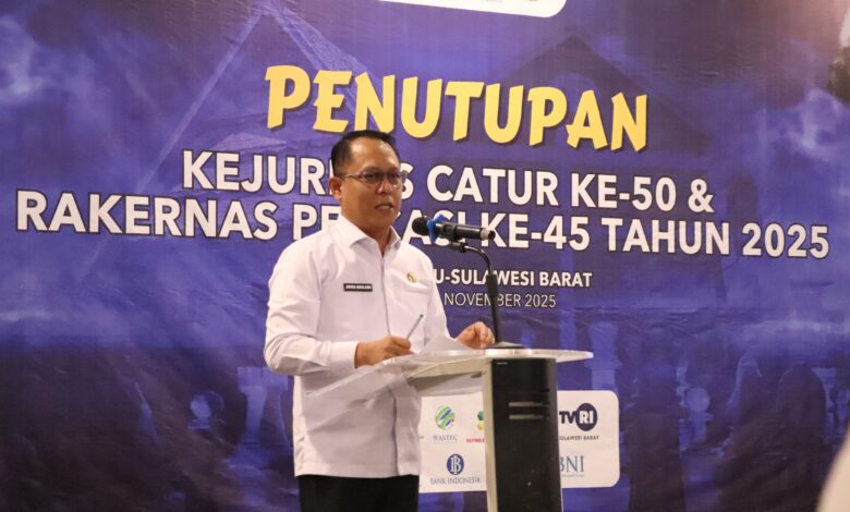 BeritaNasional.ID MAMUJU SULBAR– Sekprov Sulbar, Junda Maulana secara resmi menutup Kejuaraan Nasional (Kejurnas) Catur ke-50 dan Rapat Kerja Nasional (Rakernas) Percasi ke-45 tahun 2025 di Ballroom Hotel Maleo Town Square (Matos) Mamuju, Rabu 12 November 2025.