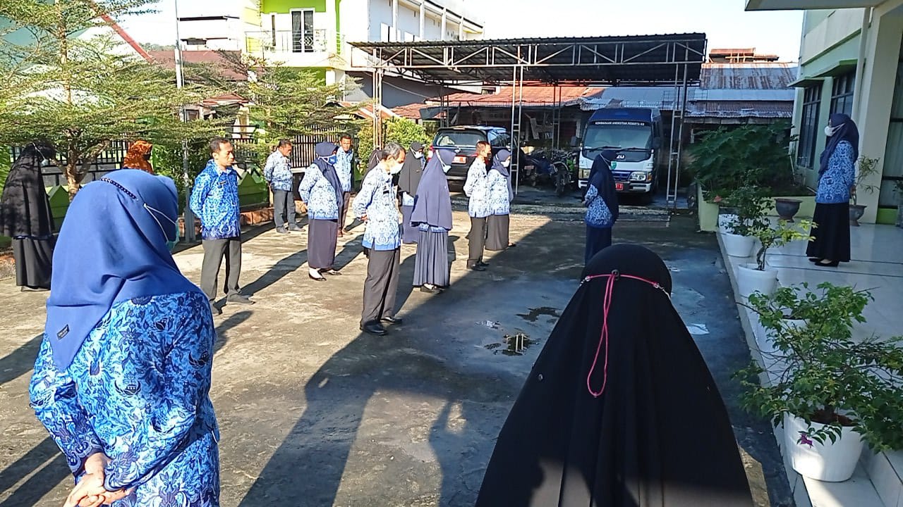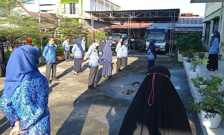 Pertama kalinya penggunaan seragam batik serentak Korps pegawai Republik Indonesia dimasa pandemi COVID-19 lingkup Disdalduk-KB Enrekang, pelaksanaan apel dengan tetap menerapkan protokol kesehatan COVID-19. (Risal Bakri).