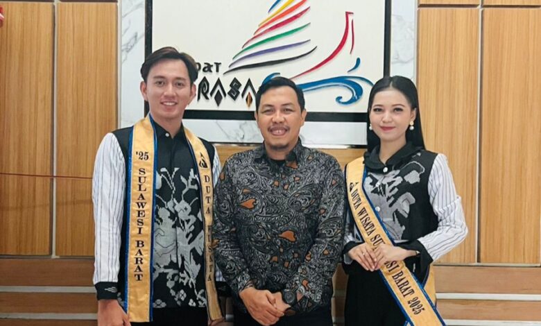 BeritaNasional.ID MAMUJU SULBAR–Kepala Dinas Pariwisata Sulawesi Barat (Kadispar Sulbar), Bau Akram Dai, menerima audiensi Duta Wisata Sulbar Evi Kurnia Syari dan Muh. Akbar Mupajrin, di ruang kerjanya pada Kamis, 23 Oktober 2025.