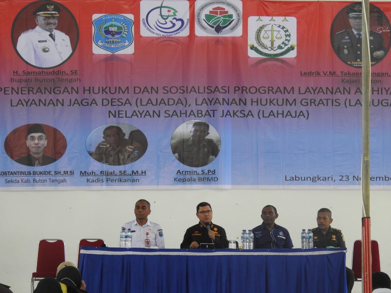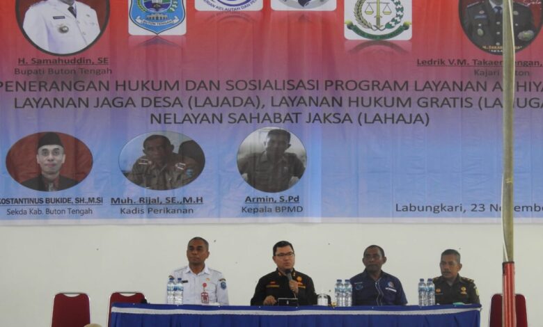 BeritaNasional.ID, BUTON TENGAH – Sejumlah nelayan, Lurah dan Kepala Desa yang tersebar di Buton Tengah (Buteng) Sulawesi Tenggara (Sultra) siang tadi, Rabu (24/11/2021) diberikan penerangan hukum dan sosialisasi program layanan adhiyaksa layanan jaga desa (Lajada) layanan hukum gratis (Lahuga) dan nelayan sahabat jaksa (Lahaja) oleh Kejaksaan Negeri (Kajari) Buton, yang bertempat di gedung kesenian Mawasangka.
