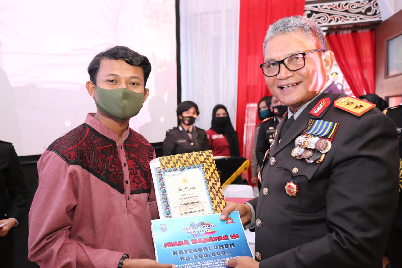 Kapolda Sumut menyerahkan langsung hadiah beserta sertifikat lomba kepada para pemenang lomba MTQ dan video kreatif. “Menyambut Hari Bhayangkara ke 74 kami menggelar berbagai perlombaan sebagai ajang untuk meningkatkan potensi dan kreativitas personel Polri maupun masyarakat”, ujarnya.