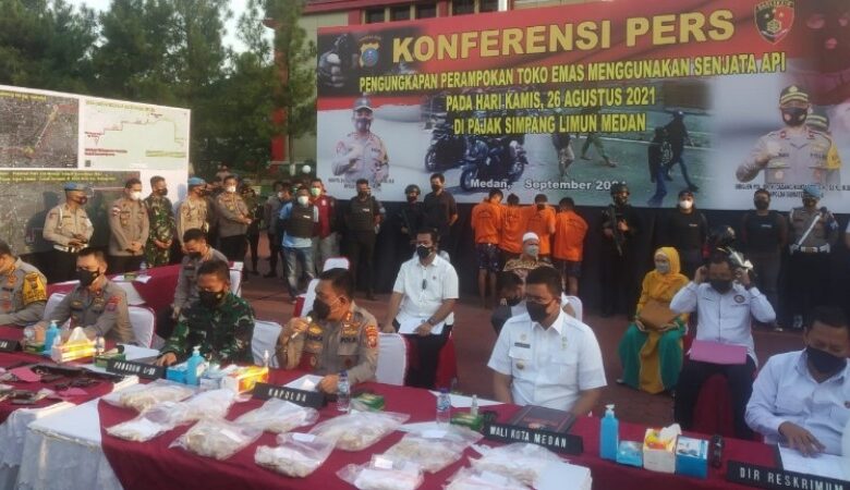“Pada Kamis, 26 Agustus 2021 yang lalu telah terjadi pencurian dengan kekerasan terhadap dua toko emas, yakni Toko Emas Aulia Chan dan Toko Emas Masrul di Pasar Simpang Limun,” kata Kapolda Sumut Irjen Pol Panca Putra saat konferensi pers di Polda Sumut, Medan, Rabu (15/9/2021) sore.