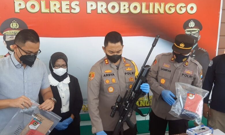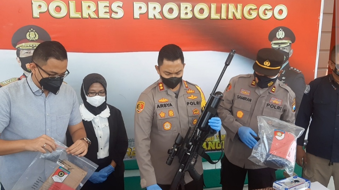 Polres Probolinggo menggelar Konferensi Pers kasus tewasnya Idam Kholik (30), warga Desa Bulang Kecamatan Gending, Kabupaten Probolinggo, yang diduga tertembak oleh peluru dari senapan angin milik Daud Patriono Imanuel (52) warga Sumbersari, Kabupaten Jember, yang terjadi pada Kamis (7/4/2022) siang.