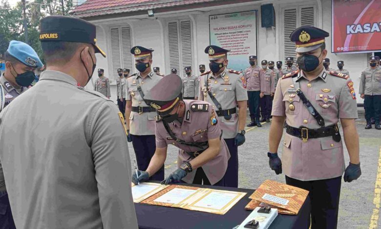 BeritaNasional.ID-PROBOLINGGO–Kapolres Probolinggo Kota, AKBP Wadi Sa’bani, memimpin upacara sertijab Kasat Samapta dan Kasat Lantas Polres Probolinggo Kota Kamis (17/11/22).