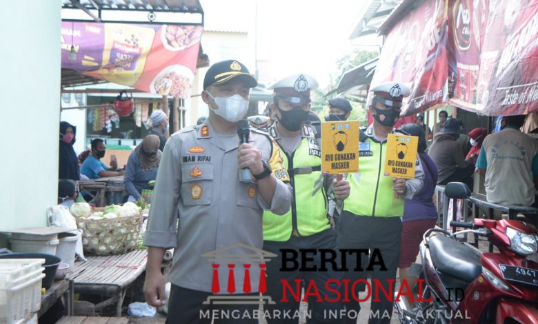 Kapolres Situbondo bersama jajarannya berkeliling di dalam pasar Sumberkolak Panarukan, Kabupaten Situbondo menyampaikan pesan-pesan kamtibmas tentang protokol kesehatan kepada pedagang dan pengunjung pasar.