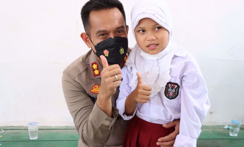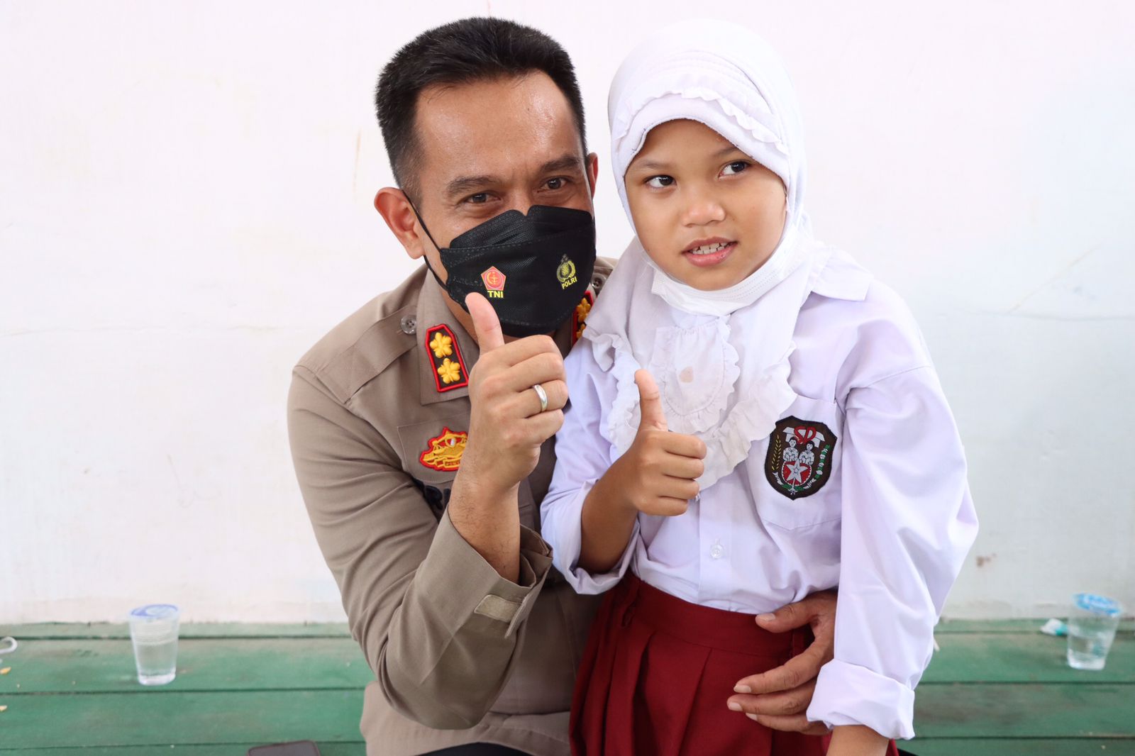 Dari pantauan awak media dilokasi vaksinasi, Kapolres Tanjungbalai menyemangati dan menyapa ramah serta bercanda dengan anak anak yang mengikuti vaksinasi serta berfoto bersama.