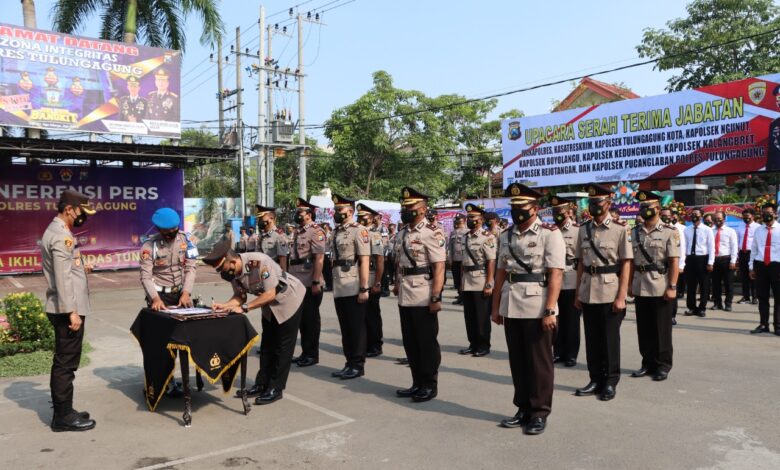 BERITANASIONAL.ID, TULUNGAGUNG – Jabatan Wakapolres dan Kasatreskrim serta 7 (tujuh) Kapolsek di jajaran kepolisian Resor (Polres) Tulungagung mengalami pergantian.
