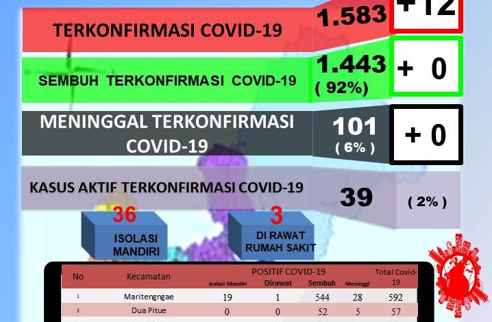 Dijelaskan Ishak Kenre mengatakan dari 39 orang terkonfirmasi Positif covid-19, 36 orang Isolasi Mandiri dan 3 (tiga ) dirawat di RS Arifin Nu’mang.