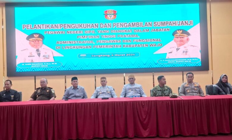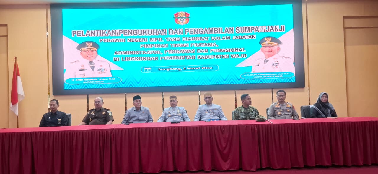 Beritanasional.id, WAJO – Jajaran pimpinan dan anggota DPRD Kabupaten Wajo menunjukkan komitmen dalam mendukung penguatan tata kelola pemerintahan daerah dengan menghadiri prosesi pelantikan dan pengambilan sumpah jabatan Pegawai Negeri Sipil (PNS) di lingkungan Pemerintah Kabupaten Wajo, Rabu (4/3/2026), di Ruang Pola Kantor Bupati Wajo.