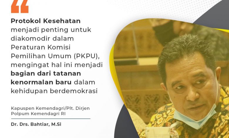 Kapuspen Mendagri/PLT. Dirjen Polpum Kemendagri RI, Bahtiar dalam rapat ini mengatakan protokol kesehatan menjadi penting untuk diakomodir dalam Peraturan Komisi Pemilihan Umum (PKPU) mengingat hal ini menjadi tatanan kenormalan baru dalam kehidupan berdemokrasi.