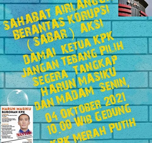 BeritaNasional.ID, JAKARTA – Sahabat Airlangga Anti Korupsi (Sabar – Anti Korupsi) rencana pekan depan akan melakukan demonstrasi ke kantor Komisi Pemberantasan Korupsi RI (KPK – RI) meminta Harun Masiku dan Madam ditangkap. Sabar – Anti Korupsi juga meminta KPK yang diketua Firli Bahuri untuk tidak tebang pilih dalam penegakan hukum.