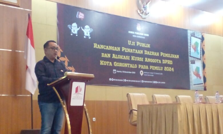 BeritaNasional.ID, Kota Gorontalo – Komisi Pemilihan Umum (KPU) Kota Gorontalo melakukan Uji Publik atas Rancangan Penataan Dapil dan Alokasi Kursi DPRD Kota Gorontalo pada Pemilihan Umum (Pemilu) tahun 2024 yang digelar di Hotel UTC Damhil Kota Gorontalo, Kamis (15/12/2022).