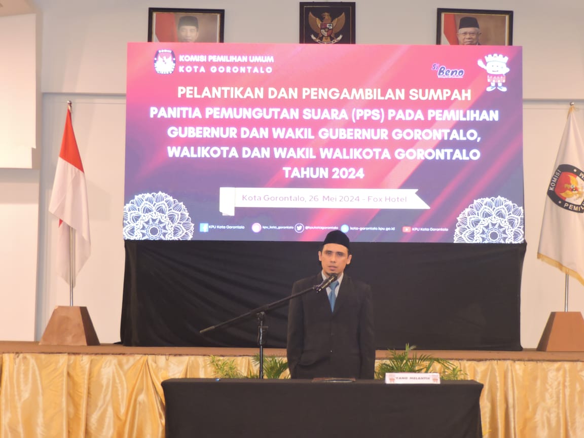 BeritaNasional.ID, KOTA GORONTALO – Komisi Pemilihan Umum (KPU) Kota Gorontalo resmi mengambil sumpah dan melantik anggota Panitia Pemungutan Suara (PPS) se Kota Gorontalo yang digelar di Hotel Fox Kota Gorontalo, Minggu (26/5/2024). Mereka yang diambil sumpah dan dilantik adalah yang telah dinyatakan lolos seleksi berdasarkan Pengumuman Nomor 237/PP.04.02-Pu/7571/4/2024 tentang Hasil Penetapan Seleksi Calon Anggota Panitia Pemungutan Suara untuk Pemilihan Gubernur dan Wakil Gubernur, Bupati dan Wakil Bupati, Walikota dan Wakil Walikota.