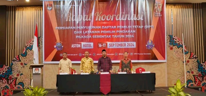 BeritaNasional.ID, GORONTALO — Komisi Pemilihan Umum (KPU) Provinsi Gorontalo menggelar Rapat Koordinasi Persiapan Penyusunan Daftar Pemilih Tetap (DPT) dan Layanan Pemilih Pindahan Pilkada Serentak Tahun 2024 bertempat di Hotel Aston Gorontalo, Senin (16/09/2024).