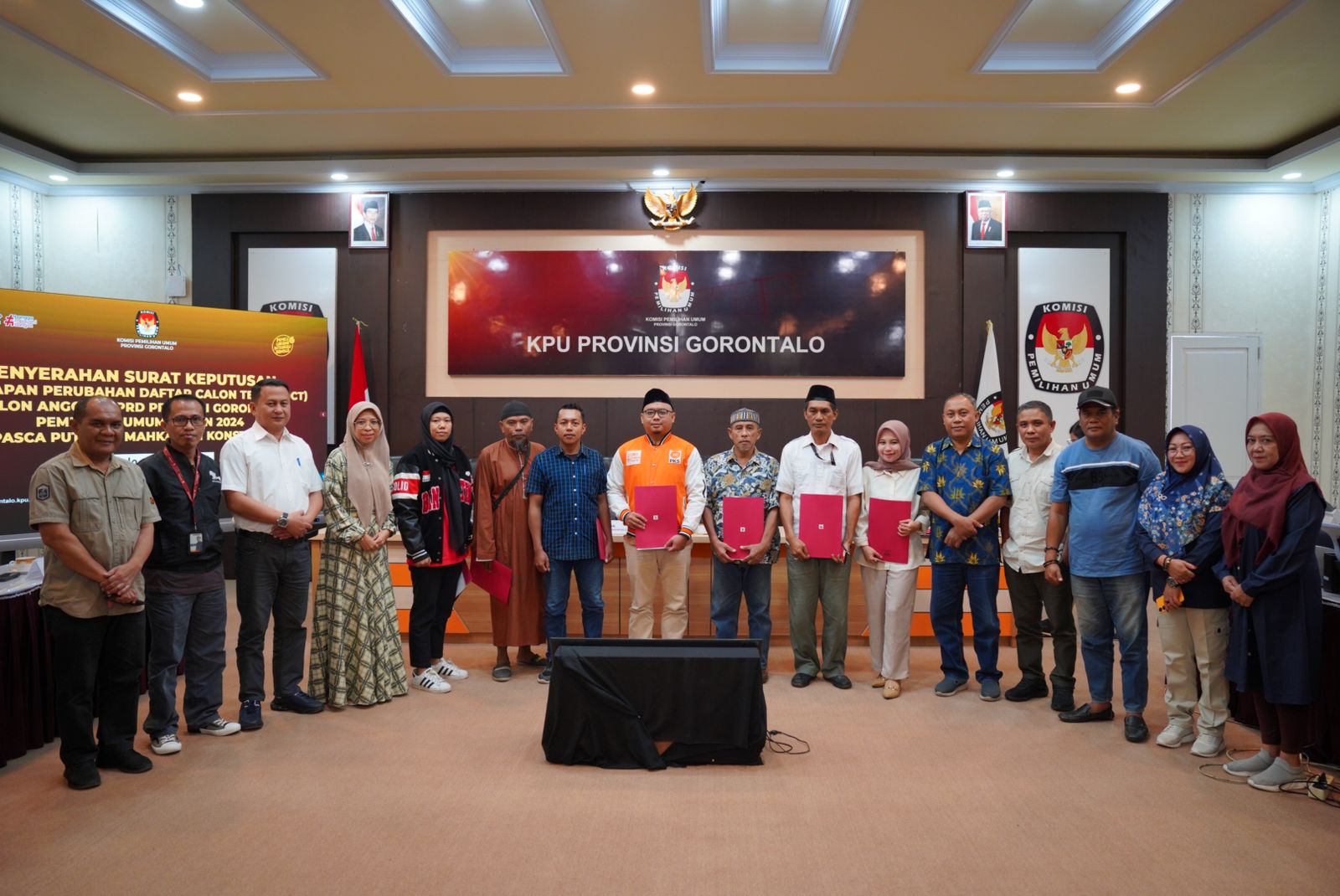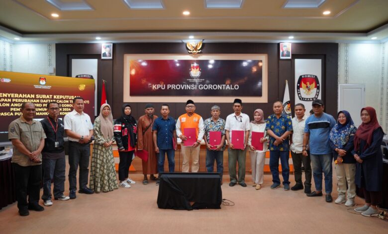 BeritaNasional.ID, GORONTALO — Komisi Pemilihan Umum (KPU) Provinsi Gorontalo menyerahkan Surat Keputusan Penetapan Perubahan Daftar Calon Tetap (DCT) Calon Anggota DPRD Provinsi Gorontalo Pemilihan Umum Tahun 2024 untuk Dapil Gorontalo 6 (Boalemo – Pohuwato).
