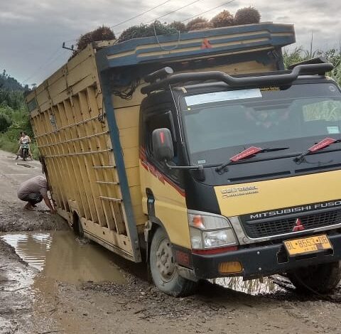 Satu unit truk bermuatan buah kelapa sawit kembali terpacak di tegah jalan lintas antar kabupaten Aceh Timur – Gayo Lues saat hendak mengelak kubang, tepatnya di kilometer 35 Desa Peunaron Baru, Kecamatan Peunaron, Kabupaten Aceh Timur, Provinsi Aceh.